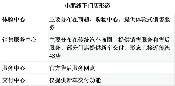 小鹏有 4 种线下门店,其中销售服务中心最接近传统的 4S 店,也是这次渠道改革的主力。