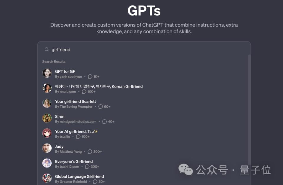 例如我们在 GPT Store 里搜 "girlfriend",结果会是这样: