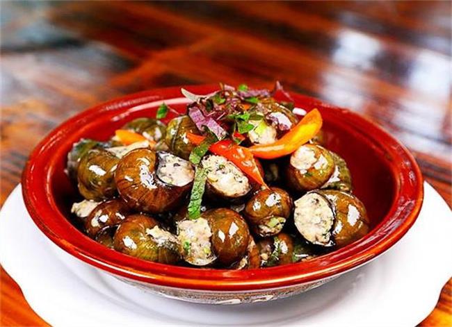 广西阳朔的田螺个头特别大,味道鲜美,也就成就了这道美食,是把田螺肉掏出来再加入猪肉,香菜调成料塞进田螺壳里面烧制而成。