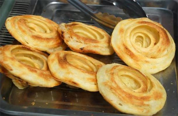 沈阳回头是一种清真美食,是把面粉揉成团压平卷成薄饼,烙熟之后再卷上馅料,吃起来饼皮筋道馅儿,料鲜美。