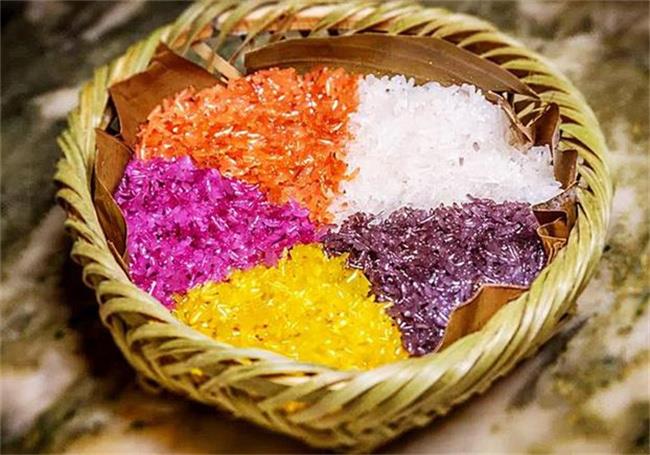 五色糯米饭是柳州当地非常有名的传统小吃,蒸出来的糯米饭是五颜六色的,这些米的颜色都是采用当地的各种野草提取的天然色素,可以放心食用。