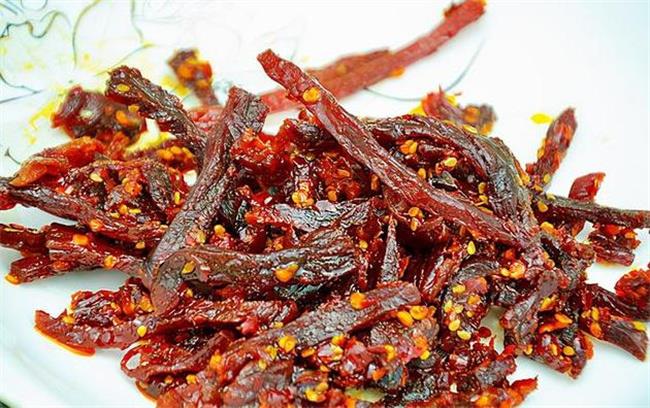 这是当地非常有名的地方特产,使用当地的优质黄牛肉,再加上天然的香料制作而成,吃起来比较辣,很有嚼劲和牛肉干有些像。