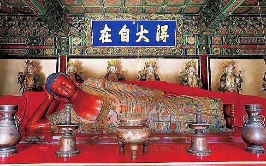 卧佛寺是北京的一个寺庙,是在唐朝的时候建成的,有一尊巨大的檀木雕成的卧佛像。