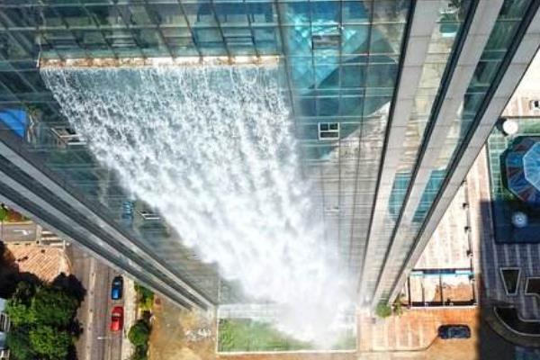 这栋大厦的总体高度就有121米,而瀑布在距离顶部10-20米的位置向下倾泻,一直流淌到地面的水池中,足足有108米高,甚至是世界上最大的风力发电机的一半高,因此当水花倾泻下来的时候,不管是从楼顶还是楼下看都非常的震撼,可以说世界上很少有这样的人造瀑布了。