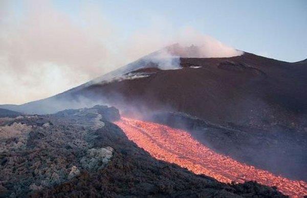 埃特纳火山,因其海拔较高,山顶还有不少积雪,地下的火山灰就象铺了一层厚厚的炉渣,凝固的熔岩随处可见。埃特纳山上还不时地发出沉闷的声响,那是气体喷出的声音。火山的热度通过地表传到游人脚上,只觉得脚底也是温热的。站在火山之巅,能感觉到脚下的火山正在微微地颤抖,这就是典型的火山性震颤。据当地火山监测站人员观测发现,每日午后两点左右火山震颤达到最高峰。