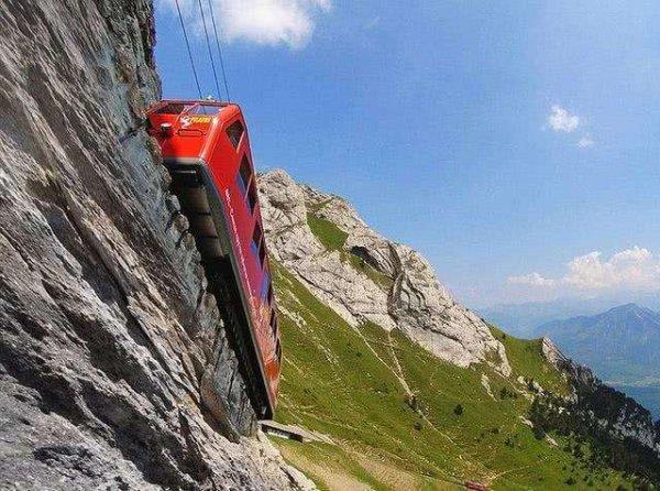 瑞士皮拉图斯山铁路全长4168米,起点的海拔高度为441米,终点为2070米,全程高度落差为1629米,整个行程几乎都是在爬坡,火车每走2米,就爬高1米,而火车的一旁就是悬崖峭壁,比坐过山车还刺激。