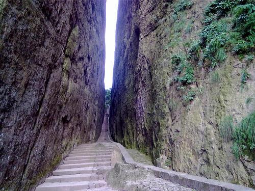 一线天景区位于武夷山群峰南端之二曲溪南面的一个幽邃的峡谷里,又称一字天。最佳考验身材的量身器,最窄只有30公分。该处有一座巨岩,宛若城廓,名甫灵岩。岩倾斜而出,覆盖三个毗邻的山洞,其顶有裂隙100余丈,宽不及1米。探身洞中,仰观崖顶裂隙,可见天光一线奇景。一线天景区主要景点有一线天、楼阁岩、凌霄峰、石门岩和虎啸岩等,是武夷山屈指可数的独具泉天趣的佳景之一。