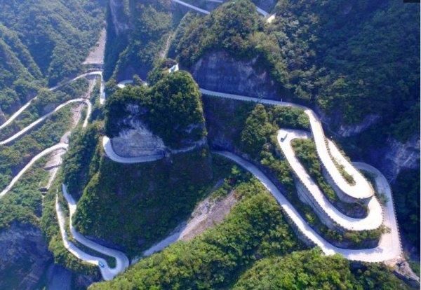 天门山是张家界永定区海拔最高的山,这里的盘山公路,全长10公里,但由于地势险峻,历时8年才竣工通车(1998年—2005年)。这条路被叫做“通天大道”,自驾在这条路上,海拔从200米急剧提升到1300米,大道两侧绝壁千仞,空谷幽深,令人心惊胆战。这里的山路不止十八弯,共计99道弯,180度急弯此消彼长,似玉带环绕山间,弯弯紧连,层层迭起,不晕车的人来了恐怕也晕车。