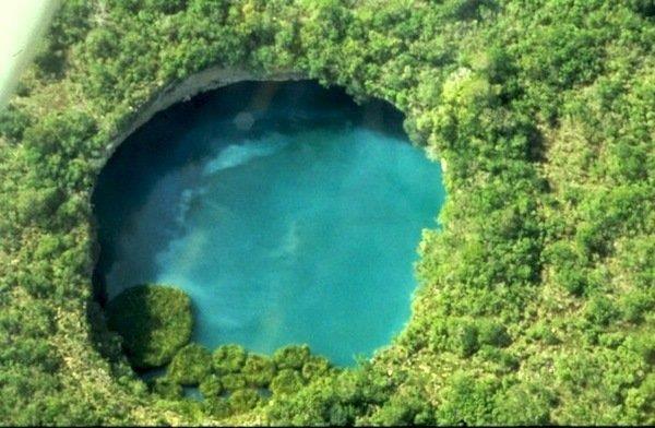 Zacatón天坑坐落在墨西哥塔毛利帕斯州,是已知世界上最深的水洞,约1112英尺(339米)深。Zacatón天坑最独特的地方便是水面漂浮着很多小岛。它们是由沉淀碳酸钙形成的,上面还覆盖着厚厚的草垫。岛屿在湖面随 风移动。洞壁上有很多新奇的微生物,研究认为甚至还有先前科学未曾关注到的物种。