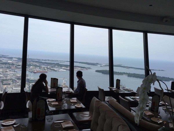 搭乘时速22公里的电梯不到一分钟(58秒)就可抵达351米处的、超过约113层楼高的旋转餐厅。旋转餐厅可容纳425人同时就餐,每隔65分钟旋转一次,游人可以一边品尝美味佳肴,一边体会登高望远的滋味,有雅兴者还可以在此一展舞姿。从这里往下看,数十层高的大楼就象孩子们堆成的积木,行驶在大街上的汽车则像甲虫一样缓缓蠕动,宽阔的安大略湖也变成了一泓清潭。真有一切都是浮云的感觉!