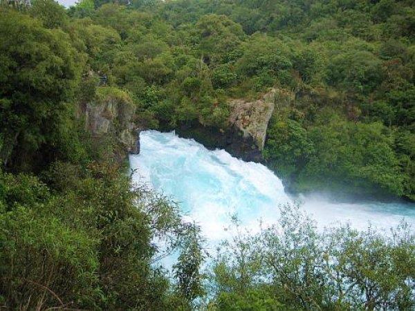 经由新西兰的陶波市新附近公路的胡卡瀑布,这个瀑布以气势磅礴著称,这里的水量速度非常的块,水一泻而下,接触到地面形成的泡沫瞬间消失,这里是一个非常适合拍照的地方,很多游客开这里将它作为背景照。