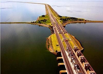 荷兰地势低平,四分之一的土地低于海平面。一直同大海进行不屈不挠斗争的荷兰人民几个世纪的艰苦努力,终于建成了总长度达1800公里的堤坝,向大海索回了70万公顷的土地。所以荷兰人一直骄傲的认为——“上帝创造了世界,而荷兰人创造了荷兰”。这条全长32.5公里连接荷兰北部的须德海大坝1932年完工,拦海大坝坝基宽90米,高出海平面10米,坝顶为高速公路。