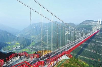 矮寨特大悬索桥位于湖南湘西矮寨镇境内。矮寨悬索桥,距吉首市区约20公里,跨越矮寨镇附近的山谷,德夯河流经谷底,桥面设计标高与地面高差达330米左右,全长1073.65m,悬索桥的主跨为1176m。该桥跨越矮寨大峡谷,主跨居世界第三、亚洲第一。