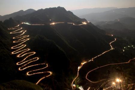 张家界天门山盘山公路有"通天大道"之称,盘山公路全长10.77公里,海拔从200米急剧提升到1300米,大道两侧绝壁千仞,空谷幽深,共计99个弯,180度急弯此消彼长,似玉带环绕,弯弯紧连,层层迭起,被誉为“天下第一公路奇观”。