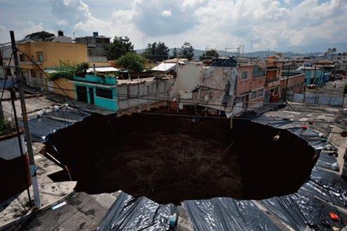 天坑,是一种地面的沉降现象,其直径从几十厘米到几百米不等,深度可达几百米。由于常年受热带暴风雨的影响,危地马拉城是天坑现象的多发地。在危地马拉近几年相继出现了两次惊人的天坑,让人觉得该地可能不适合自己居住,很多人认为这是天灾,是世界末日的前兆。