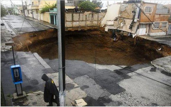 危地马拉天坑吞噬了超过一个十字路口的区域,有一栋3层的楼房和一栋普通的房屋已经陷入坑内。然而它还在不断的扩展,使得地面不停的在塌陷。早在2007年,距离最近出现天坑的不远处也曾出现过一个类似的天坑,但当时人们不知道如此大的天坑到底是什么原因导致的。