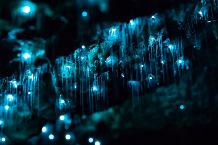 怀托摩萤火虫洞里面有很多颖火虫附着在钟乳石上面,形成了这里独特的景观,给人一种梦幻星空的感觉,位置在新西兰。