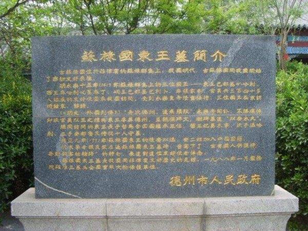 苏禄系斐列宾与婆罗洲间之群岛,内有苏禄岛,即明代苏渌国。”明永乐十五年,以苏禄国东王巴都葛•巴哈刺为首,随同西王、峒王并率领眷属和侍从三百四十多人,到中国来进行友好访问*东王一行在八的盛情接待,同年九月启程回国t当他们沿运河南下,路过德州以北的安陵时,苏禄东王突患急病,不幸逝世。噩耗传到北京,明成祖朱棣特派礼部郞中陈世启带着祭文赶往德州,举行了隆重的葬礼,并按中国的王制为东王造墓。