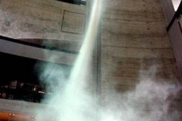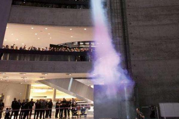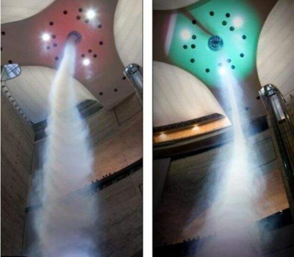 这个世界最大的龙卷风不是刻意制造的,而是种消防设施的补救措施。原因是这个博物馆刚建成时,在安全消防检查时,发现没有达到要求(居然国外也有这种情况),而当时考虑到种种因素,博物馆方不可能再去返工,在不破坏原有设计的情况下,就来了这样一个奇思妙想,大厅里安装上这样一个抽风系统,这样当火灾发生的时候,致命的浓烟就能迅速的被抽出去,这也就能够争取更多的逃生时间,据说可以在火灾发生时能瞬间抽空28吨气体,火灾时产生的浓烟也就不担心了。