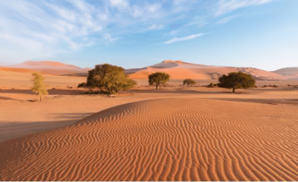 卡拉哈里沙漠是属于盆地地形大概占地面积有63万平方千米,这个沙漠经常出现单独的岛山植物,一般都属于灌木植物,雨季的时候会有比较茂密的植物。