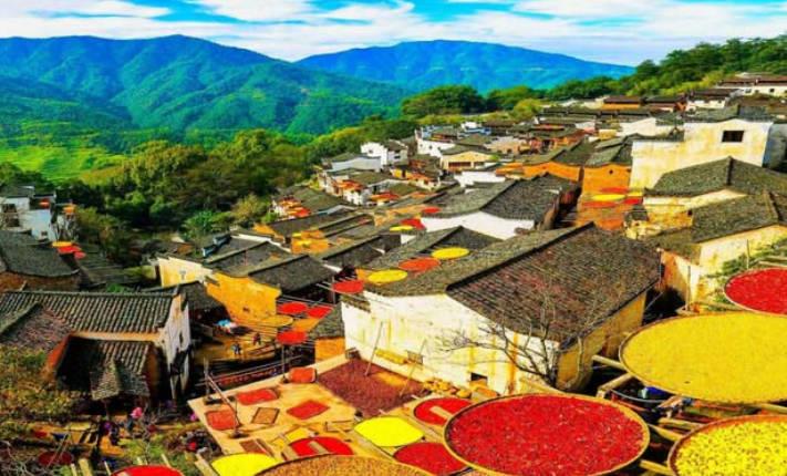 婺源的秋天,让你仿佛走进了童话一样,整个身子都弥漫着丰收的喜悦,在房顶上晒着各种颜色的农作物。远远望去就像一幅写实的水墨画。