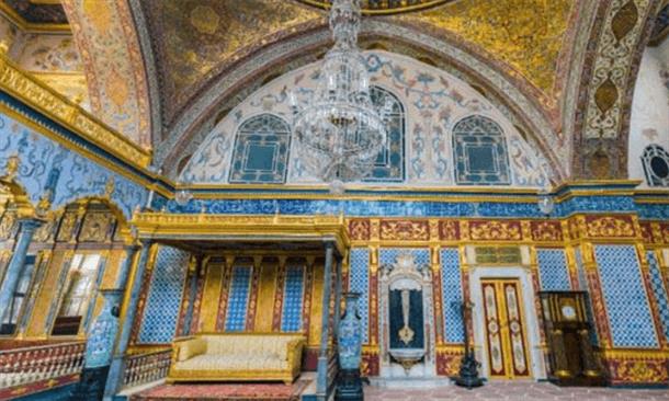 托普卡普皇宫刚从外表上看,就给人金碧辉煌的感觉里面的装修更是奢华至极,是当年苏丹王朝办公的地方,宫殿里面及其涉华宫殿外面是一个巨大的庭院。