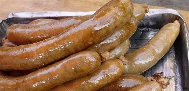 油肠是用羊油再加上肉丁一起灌到羊肠子里面制作而成煮熟以后吃起来味道特别鲜美,满嘴飘香的感觉具有浓郁的心灵风味。