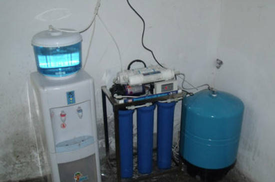 2、将水龙头安装在水漕适当的位置上,之后固定好水龙,再把2分水管插入和水龙头连接口。剪取适当的水管将原水、纯水、压力桶和废水管分别连接好,再把进水总阀门关门,同时将进水三通和2分球阀安装好。安装前检测水压,若水压高于0.4MPa就需要加装减压阀装置。