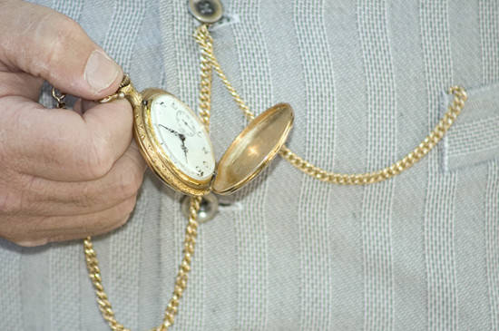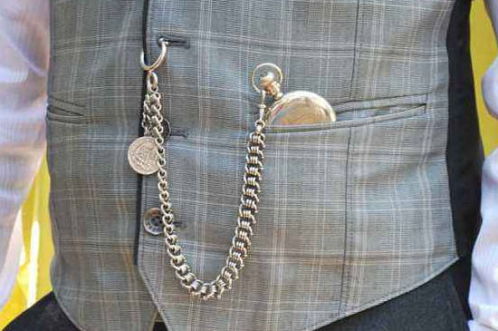 想要佩戴怀表,一定要搭配一件结实挺括的西装。找到怀表的链扣,将链扣和西装的第二个或者是第三个扣眼扣在一起,把另一端的怀表放在西装两侧的兜里,想要查看时间的时候掏出怀表看一眼就可以了。
