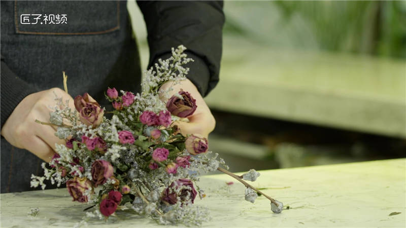 尤加利果,多头玫瑰,单支的玫瑰,情人草这4种花材作为干花的主材料。