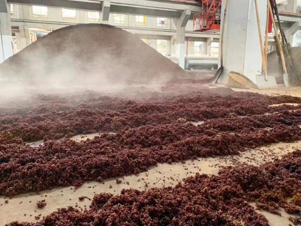 堆积发酵又称阳发酵,酒醅堆积于地面两米多高,形似一座小山,与空气充分接触,尽可能多地网络微生物参与发酵,发酵时间需要酿酒师依据温度灵活掌握,酿酒师把手插进堆子,依据烫手的程度进行判断。当堆顶温度达45---50°,酒醅有香甜味和酒香味时,即可入窖。通过堆积发酵,酒醅中的微生物利用粮食中的淀粉和糖分物质,会产生一定量的有机酸、糖分、酒精和其他营养物质,这些物质起到调节温度和水分的作用,有利于入窖后微生物继续生产繁殖和糖化发酵。