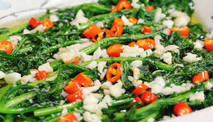 食材:茼蒿300克、大蒜3瓣调味料:香油1克、油辣子4克、醋1克、生抽2克、盐1克