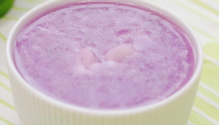 7、锅中放入适量水烧开,放入大米、糯米煮20分钟,再放入山药、紫薯,煮至粥粘稠即可出锅。