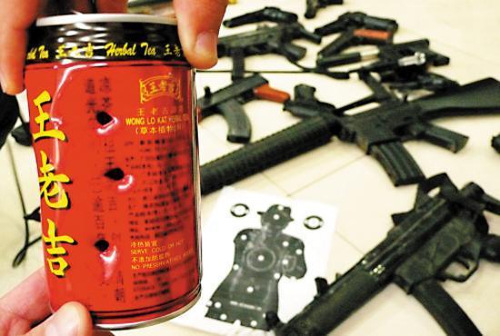 警方在易拉罐上测试仿真枪械的威力。图片来源:新华网