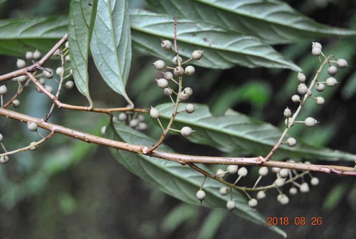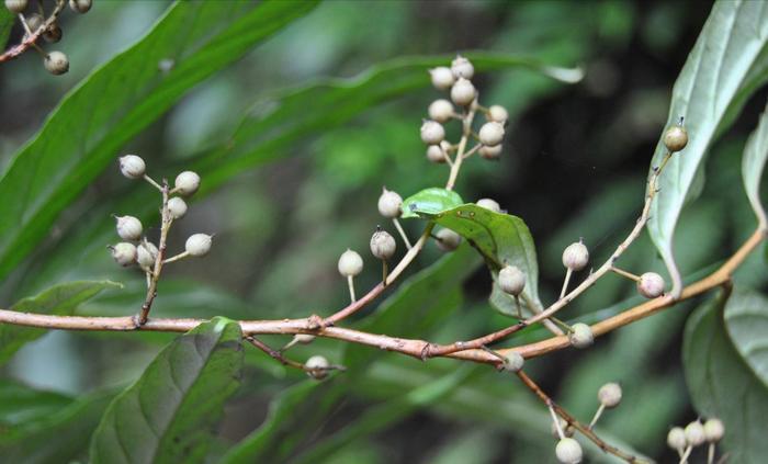 150米到2000米的海拔它都有可能分布,常生于山坡灌丛,或者是阴凉的疏林下等,花期是1到3月,很可惜错过了花期,还好没有错过果期,你看这个就是它的果实了,看它长得这个白白的样子,而且是这样子一串一串的,非常的迷人。