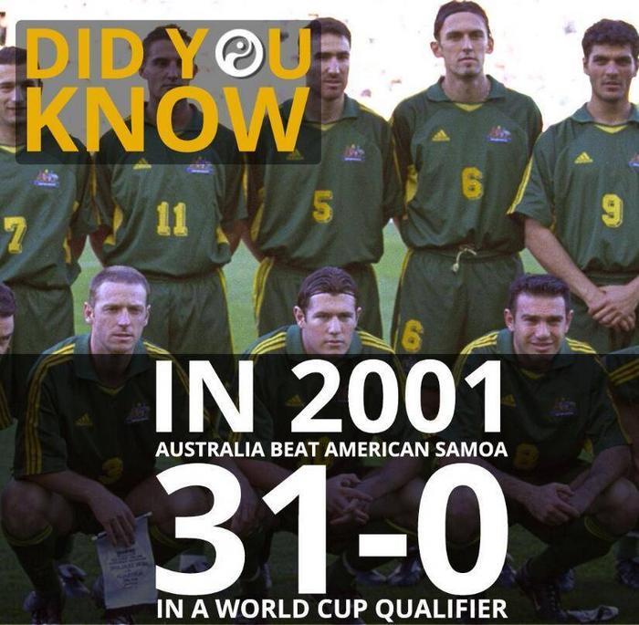 比如2001年4月,在2002年韩日世界杯预选赛中,澳大利亚曾经以31-0的比分击败美属萨摩亚,创造了国家队之间最悬殊的比分记录。