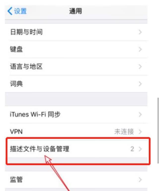 4.此时我们需要打开设置——通用——描述文件与设备管理,点击它。