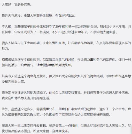 这则消息,甚至也是由她的公司亲自披露的:官方的说法是朴信惠跟交往了四年的男友崔泰俊喜得新生命了,打算在明年1月22号办婚礼。