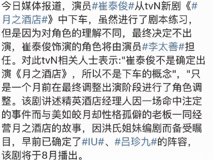 当然,后来官方并没宣布他牵涉其中,报道的推进也没涉及他只字片语。但崔泰俊受风波影响仍旧不小,还因此掉了重要的影视资源(后来大爆的《德鲁纳酒店》)。