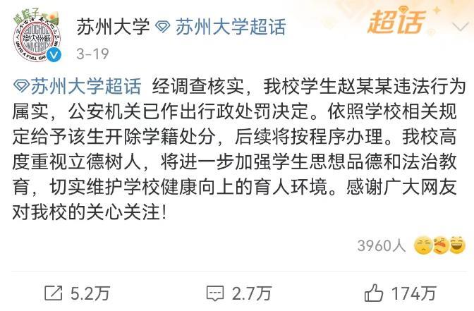 赵某峰是苏州大学2019级在校学生,事件一出苏州大学立即进行彻查,警方也对此立案调查。