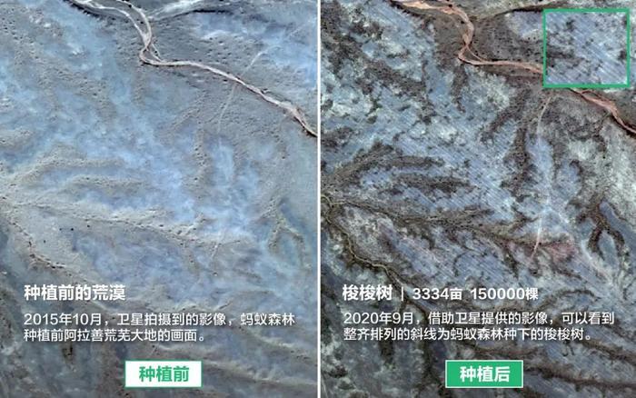 2020年9月,蚂蚁森林联合专业机构为277号林拍摄过卫星影像,可以看到整齐排列的斜线为蚂蚁森林种下的梭梭树,与2015年同一地区种植前的卫星图形成鲜明对比。