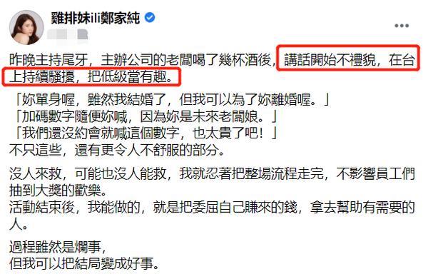 而这所有的事情还要从郑家纯发文说起,1月31日,她在社交平台上控诉自己主持节目遭到性骚扰,不仅有公司老板,现场的一名男主持,同时还有一位知名男歌手,而这名男歌手也就是郑家纯后来所指名的翁立友。