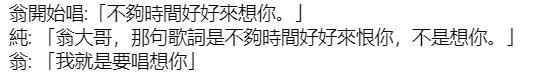 两人合唱时,翁立友先是将歌曲中的“恨你”改为“不够时间好好来想你”,当她指出歌词不对后,对方却说“我就是要唱想你。”