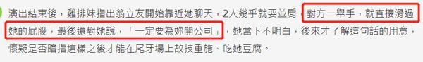 当时郑家纯并没有太在意,可翁立友却愈发变本加厉。在演出结束后,她指着翁立友身体不断靠近她,对方一抬手放下时就划过她的屁股,还对她说“一定要为你开公司”。