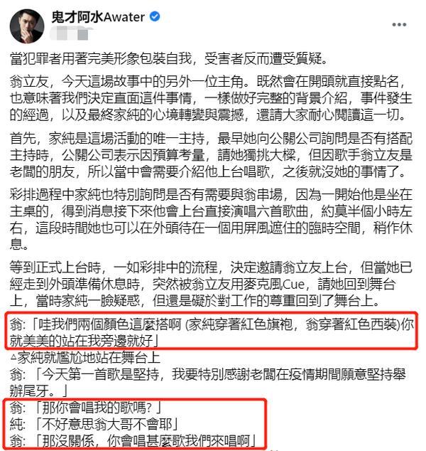 郑家纯向一位名叫“鬼水阿才”的网红哭诉,并还原了当时的经过。当天,郑家纯正打算采访翁立友,对方却突然邀请她合唱歌曲,郑家纯明确表示不会,但还是硬被安排一同合唱。