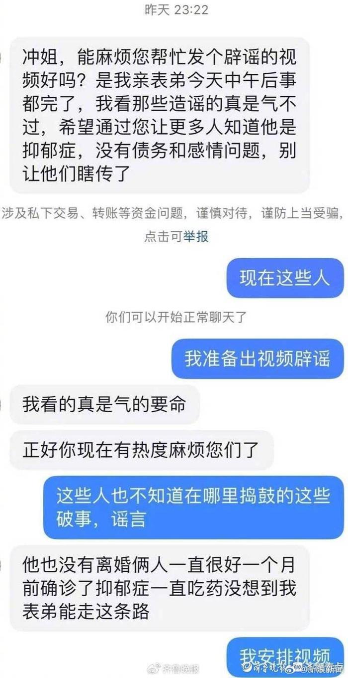 “10月16日,还有一位自称是跳河男子表姐的网友通过社交平台私信联系我们,让帮忙发一个澄清视频。”从郭先生提供的聊天截图来看,这名网友称呼跳河男子为“表弟”。在希望救援队发布辟谣视频的同时,说明了跳河男子没有债务和感情问题,表示“希望让更多人知道他是抑郁症”。