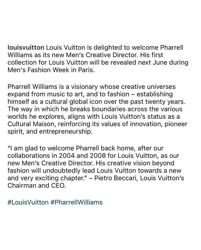 终于,在今天迎来 Louis Vuitton 最新官方通告,宣布已经正式任命「菲董」Pharrell Williams 成为新任男装创意总监。