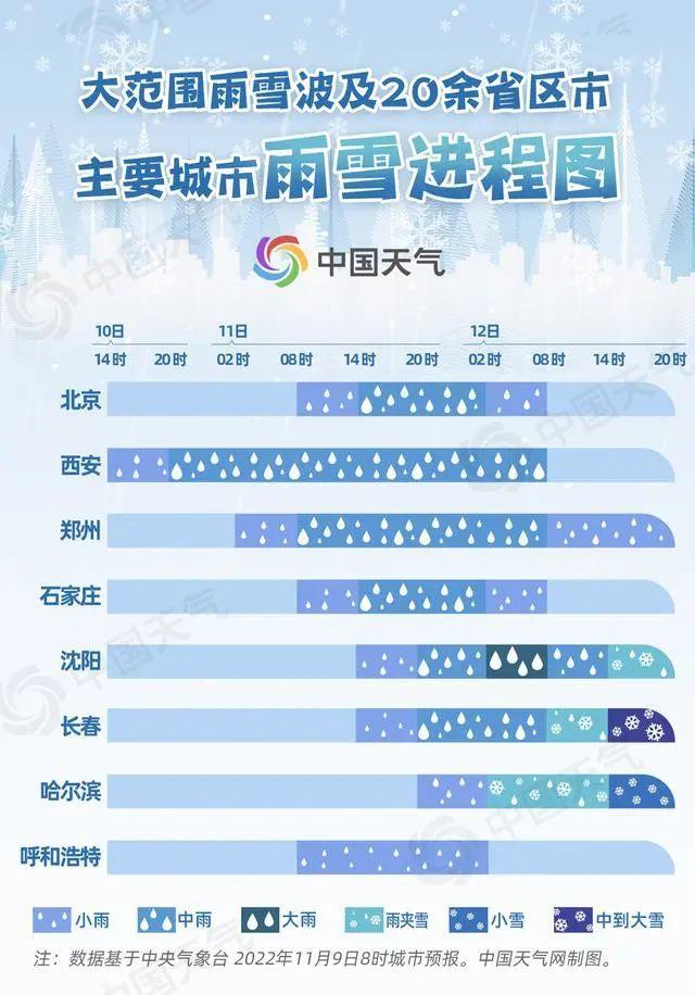 雨雪天气将波及20余个省区市,华北、东北等地多地有中雨、局地大雨,部分地区还会飘雪,长春、哈尔滨等地或迎今冬初雪。本轮雨雪过程持续时间长、范围广、部分地区强度较强。