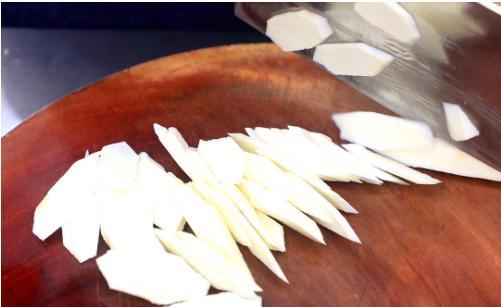 1.首先,我们把山药的外皮刮干净,切成均匀薄片,刮皮的时候最好带上手套,否则容易皮肤过敏。
