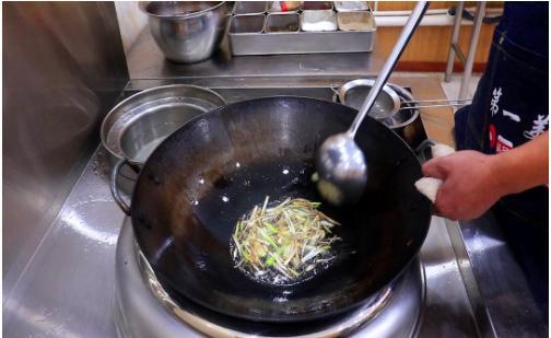 3.下面,我们先榨点葱油:把锅烧热、多倒一些油,油温五成热是倒入刚刚切好的葱丝,开小火、搅动着慢慢炸,提取里面的葱油。葱丝炸成金黄色时关火倒出,葱油炒菜味道更香。